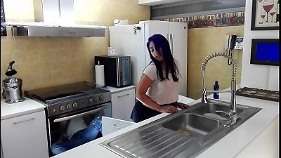 tiny sister asks her older stepbrother to teach her how to cook while he drills her